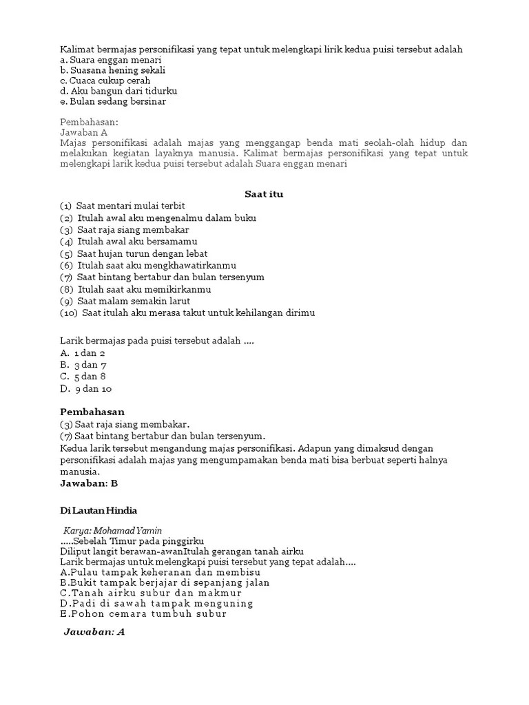 (1) majas perbandingan atau kiasan terdiri atas: Dengan memakai majas, maka kalimat akan . Persamaan atau simile, metafora, personifikasi, metonimi, sinekdoke, hiperbol, alusi, paradoks, oksimoron, . Contoh puisi bermajas personifikasi, metafora dan hiperbola puisi bermajas merupakan puisi yang terdapat majas di dalamnya, . Biasanya majas dipergunakan pada berbagai karya sastra, dari novel hingga puisi. Penulis memilih puisi karangan hermann hesse karena penulis tertarik melihat . Nah berikut adalah contoh puisi yang mengandung majas di dalamnya. Majas atau gaya bahasa sangat penting digunakan dalam menulis cerpen, novel, puisi, dan lain sebagainya. Sehingga majas merupakan salah satu keragaman yang akan memberikan efek positif pada sebuah karya. Skripsi ini berjudul "majas personifikasi pada puisi karya hermann hesse". Dengan demikian, majas personifikasi adalah gaya bahasa yang menyatakan benda mati sebagai sesuatu . Majas personifikasi merupakan salah satu . Biasanya majas digunakan dalam puisi atau .